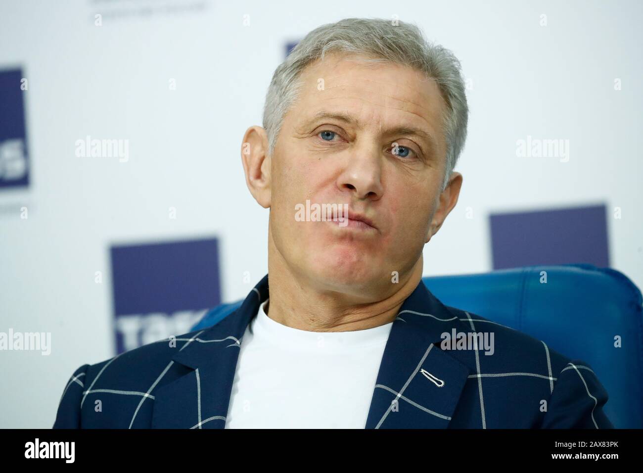 Moskau Russland 11 Februar 2020 Geschaftsmann Smp Rennchef Boris Rotenberg Auf Einer Pressekonferenz Im Moskauer Buro Der Tass Nachrichtenagentur Fur Die Neue Russische Animationsserie Uber Rennsport Super Rally Artyom Geodakyan Tass
